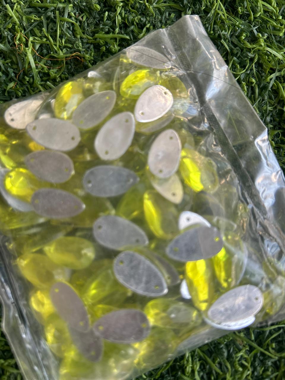 Add a sparkling highlight to any garment with these Oval Two-Hole Acrylic Stones. Made with a faceted surface that reflects light beautifully, these lightweight embellishments are perfect for festive, bridal, and designer outfits. The two-hole design makes stitching easy and secure, ideal for blouses, lehengas, saree borders, and craft projects. Available in a bright yellow tone with a silver backing for extra shine
